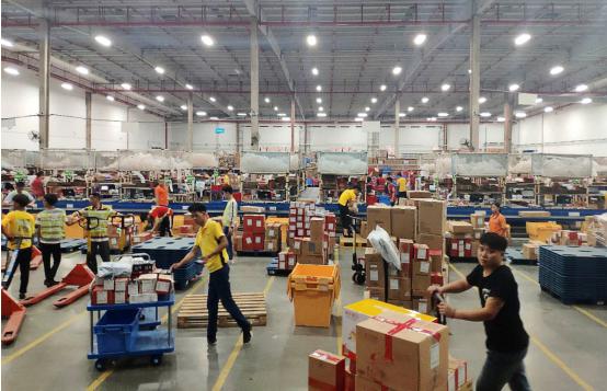 凌晨1点多,深圳一苏宁物流基地内热火朝天