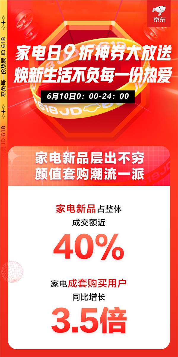 6月10日,京东618家电品类日强势来袭,黑电、冰洗、空调、厨卫、小家电各品类同步迎来新高点。新兴品类受到追捧,新品占整体成交额的近40%,家电成套购买用户同比去年增长3.5倍,呈现出强大活力与爆发力。