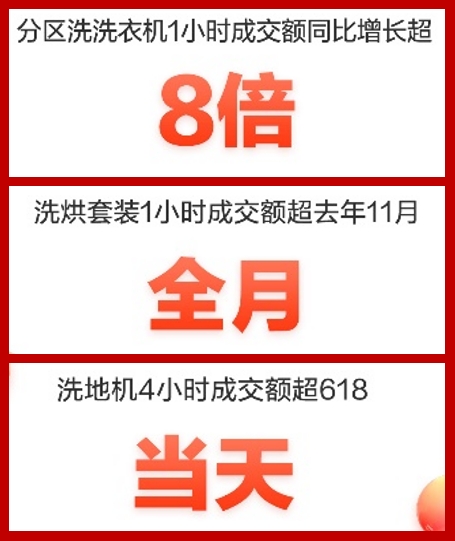 当然,能为人们节省更多时间去专注做自己喜欢的事的产品远不止这些。31日晚8点,衣物护理机前1小时成交额,较去年11.11同比增长5倍;开售4小时,美的洗碗机单品成交额超1500万,西门子洗碗机单品成交额超千万,均创本品牌新纪录。可见开创晚8点模式,无论对消费者或是商家,都有巨大的积极影响。