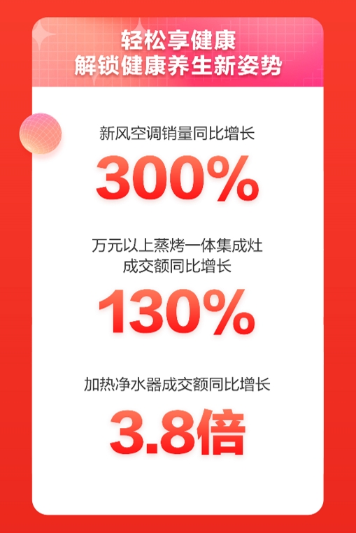 从早年的“制造”到当今的“创造”,家电产品的健康属性也迎来时尚升级。京东家电联手品牌伙伴不断推出的各类尖货家电早已脱离了单一的使用功能,从冰冷的物件变成了可以思考、有行动力、能为我们解决各种生活难题的“贴心管家”。在全民养生潮下,新风空调、集成灶、加热净水器等健康新品类火热面世。新风空调作为人们在追求品质生活中呼吸健康空气的保障,其增氧换气、控温调湿、除菌净化等功能,正在被越来越多消费者关注。京东11.11“家电品类日”统计数据显示,新风空调销量同比增长300%。生活在饮食大国,人们对食补养生更为讲究,集蒸箱、烤箱、油烟机、灶具于一体的集成灶,因健康、时尚、省地等优点,成为很多家庭在厨房家装换新时的首选,万元以上蒸烤一体集成灶成交额同比增长130%。还有多档水温、方便每个家庭成员随时使用的净热一体加热净水器成交额同比增长3.8倍,日常用水直饮、冲奶、做饭、泡茶都不在话下。