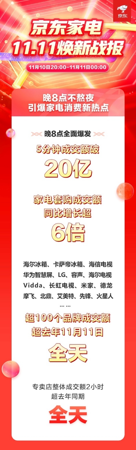 11.11期间,在“晚8点”的推动下,京东家电全品类实现爆发性增长,11月10日晚8点开场5分钟,京东家电整体成交额破20亿!4小时家电套购成交额同比增长超6倍!京东家电专卖店整体成交额2小时超去年同期全天!这个11.11,京东家电带领品牌伙伴不断焕新消费者的品质生活,让“晚8点”成为11.11家电消费“新时点”。