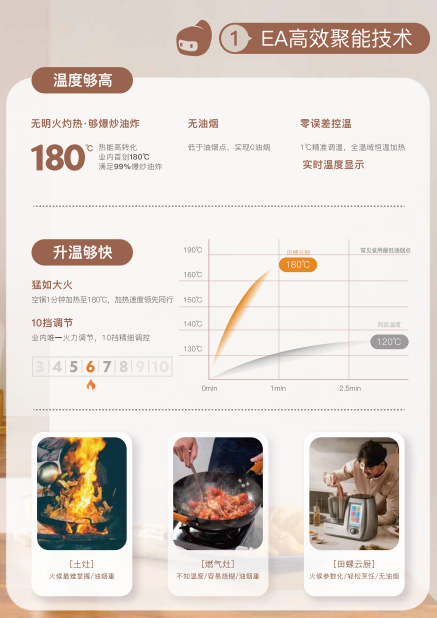更为重要的是,田螺云厨不仅可以做到“无油烟”,其烹饪的饭菜也“够火候”。中式烹饪极为讲究火候,既要火力够大,又要懂火候怎么控制。燃气灶看起来“火够大”,可柱火源温度集中在下部,热量损失很大,热效率不高。田螺云厨具有EA高效聚能技术,能够高效转化能源,升温够快,温度够高,更能达到中式烹饪所需要的火力大小。此外,田螺云厨借助AI云计算,将大厨才能掌握的火候经验转为数据,让机器代替用户来掌控烹饪中的火候,如此以来,哪怕没有烹饪经验的厨房小白也能做出堪比菜馆的美味。