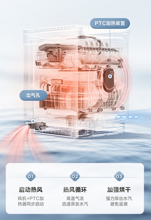 餐具清洗干净后,残留的水渍很容易滋生细菌,产生异味,同样也会给饮食健康带来危害。而美的骄阳洗碗机RX600W在清洗过程中,采用PTC加热装置与涡轮双风机同时启动,疾速送风,形成热风循环烘干使餐具更快干爽,解决湿冷、发霉、异味问题,餐具使用更放心。