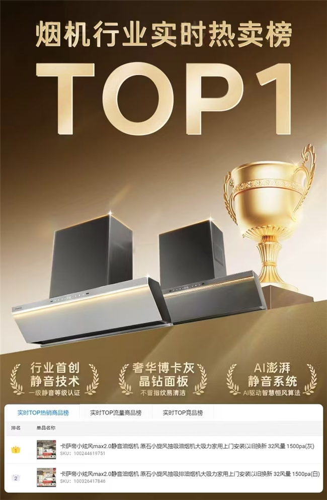 卡萨帝小炫风Max2.0 斩获3月高端烟机热卖榜TOP1